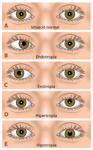 - Vertical: Quan un dels ulls es desvia cap amunt o cap avall (hipertropia o hipotropia).