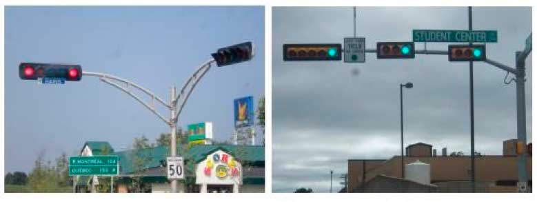 A la izquierda, semáforos de Canadá, a la derecha, semáforos en Texas, EEUU.