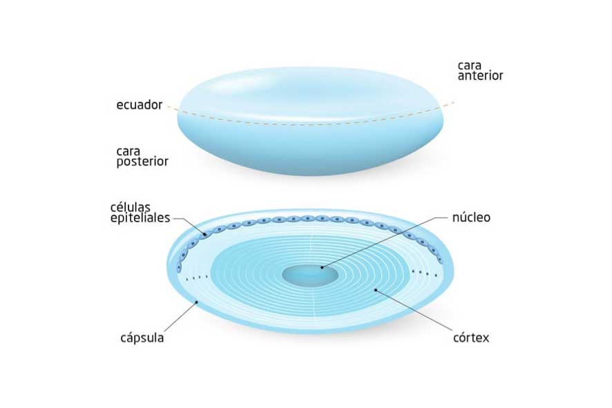 - Cápsula, las fibras que rodean todo el cristalino y compuesta por: cápsula anterior (se sitúa en la cara anterior, desde su ecuador) y cápsula posterior (se sitúa en la cara posterior).
