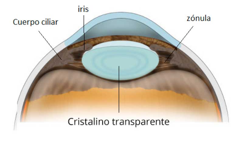 El cristalino se encuentra sujeto al ojo en todo su contorno por unas fibras transparentes llamadas zónulas de Zinn, las cuales conectan el cristalino con el cuerpo ciliar. Esta estructura contiene el músculo ciliar, que es el encargado de cambiar la curvatura del cristalino para así enfocar objetos cercanos (acomodación).