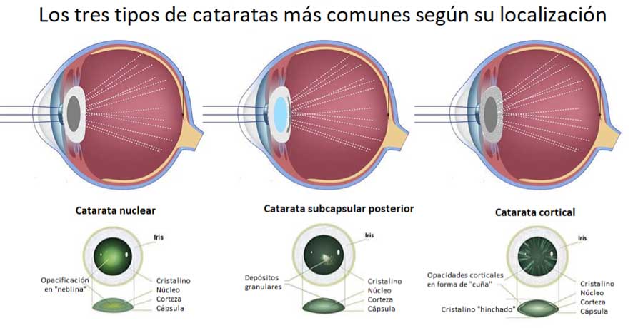 Según la localización de la catarata dentro del cristalino, hay sobre todo tres tipos que son los más frecuentes, los cuales son:
