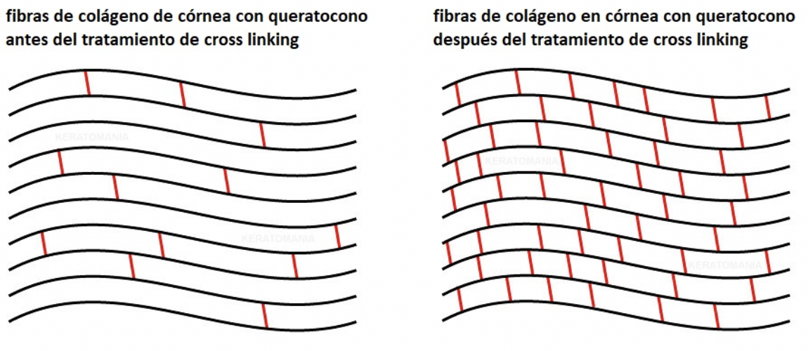 Cross-linking: Se trata de una técnica quirúrgica que ayuda a aumentar la rigidez corneal. Consiste en instilar en la córnea riboflavina y después se irradia con rayos ultravioleta. Esta vitamina crea nuevas conexiones en las fibras de colágeno. Es una técnica indicada cuando el queratocono está progresando y ayuda a frenar su avance. No se puede realizar cuando la córnea está muy adelgazada (casos avanzados).