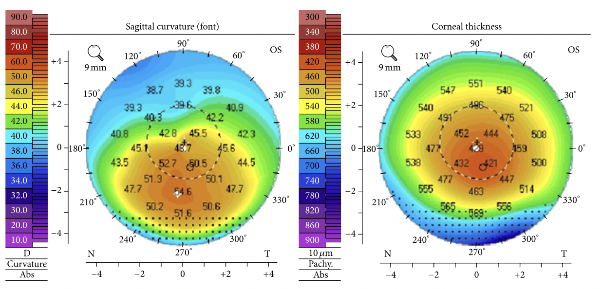 Ejemplo de topografía en un queratocono. El mapa de la izquierda es un mapa de curvatura, donde se puede observar la zona más curva en la parte inferior (más naranja). El mapa de la derecha es un mapa de espesor corneal, donde se ve la zona más adelgazada que coincide en posición con el cono que se observa en el mapa de curvatura.